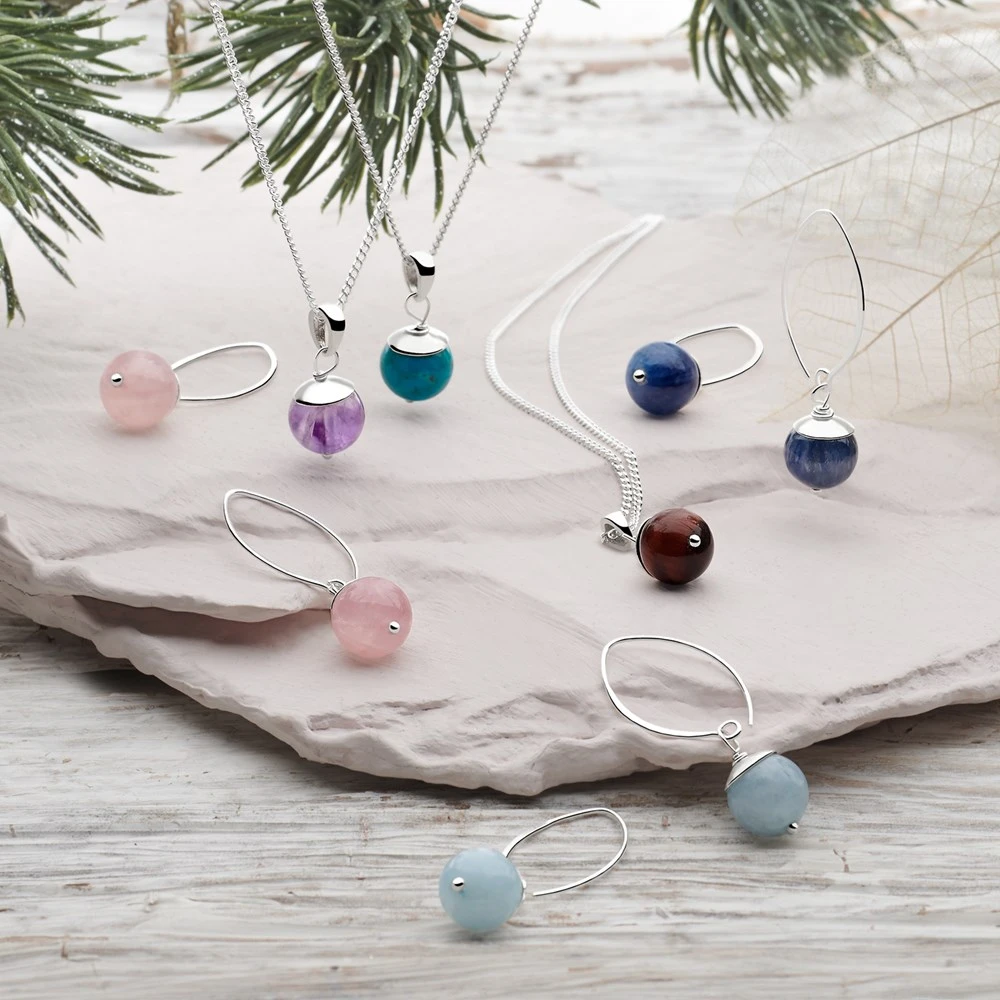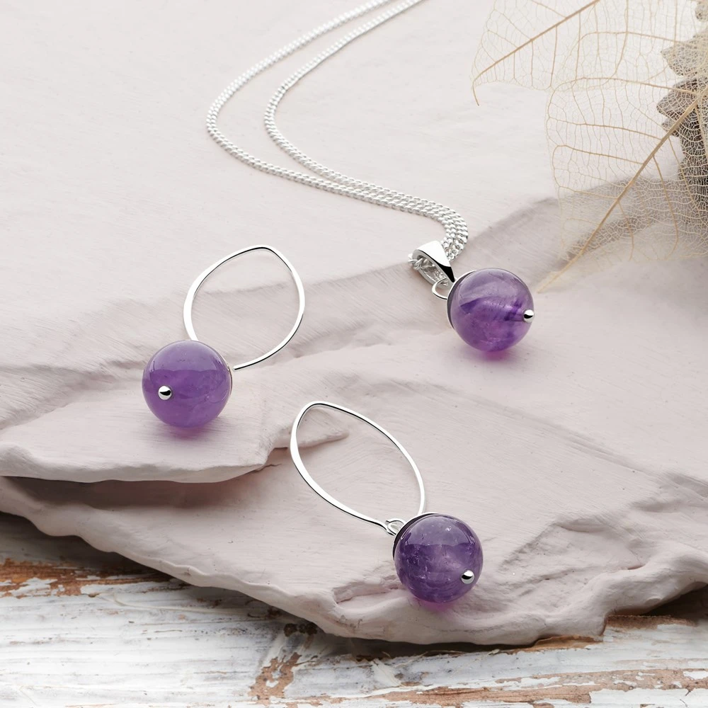 Beautifully smooth baubles of amethyst showcase it’s deep purple hues. Amethyst is said to be the stone of spritual healing and calm. This stunning pendant is finished with silver accents.
