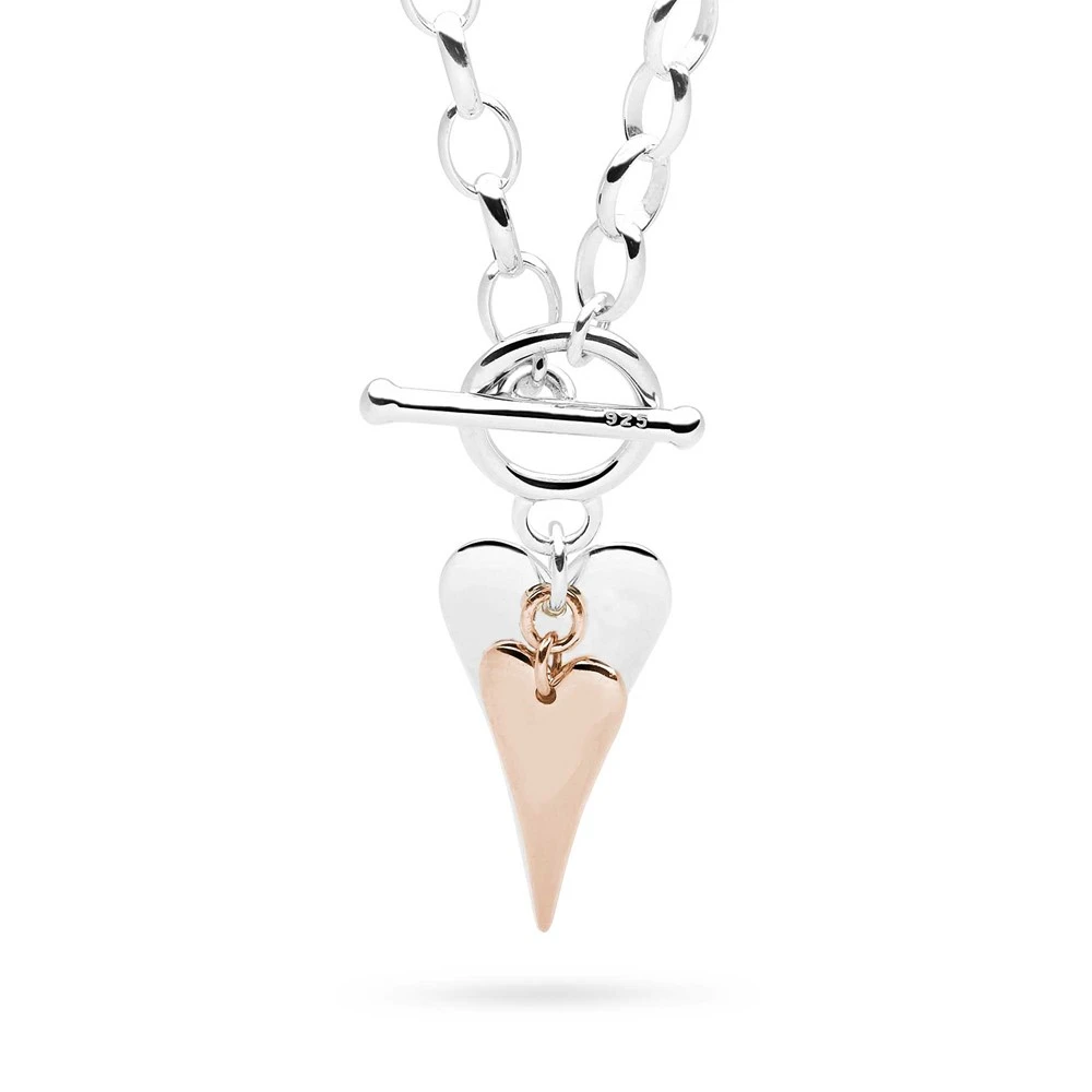 A smooth silver heart is highly polished to reflect the dazzling beauty of a pointed, rose gold-plated heart. Finished with a classic T-bar, these feminine heart pendants sit on a chunky chain for a classic silhouette designed for the sophisticated woman.