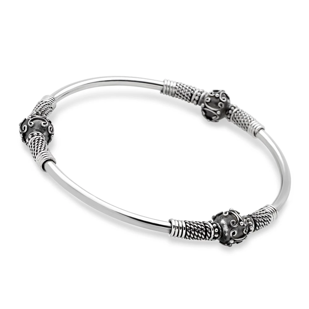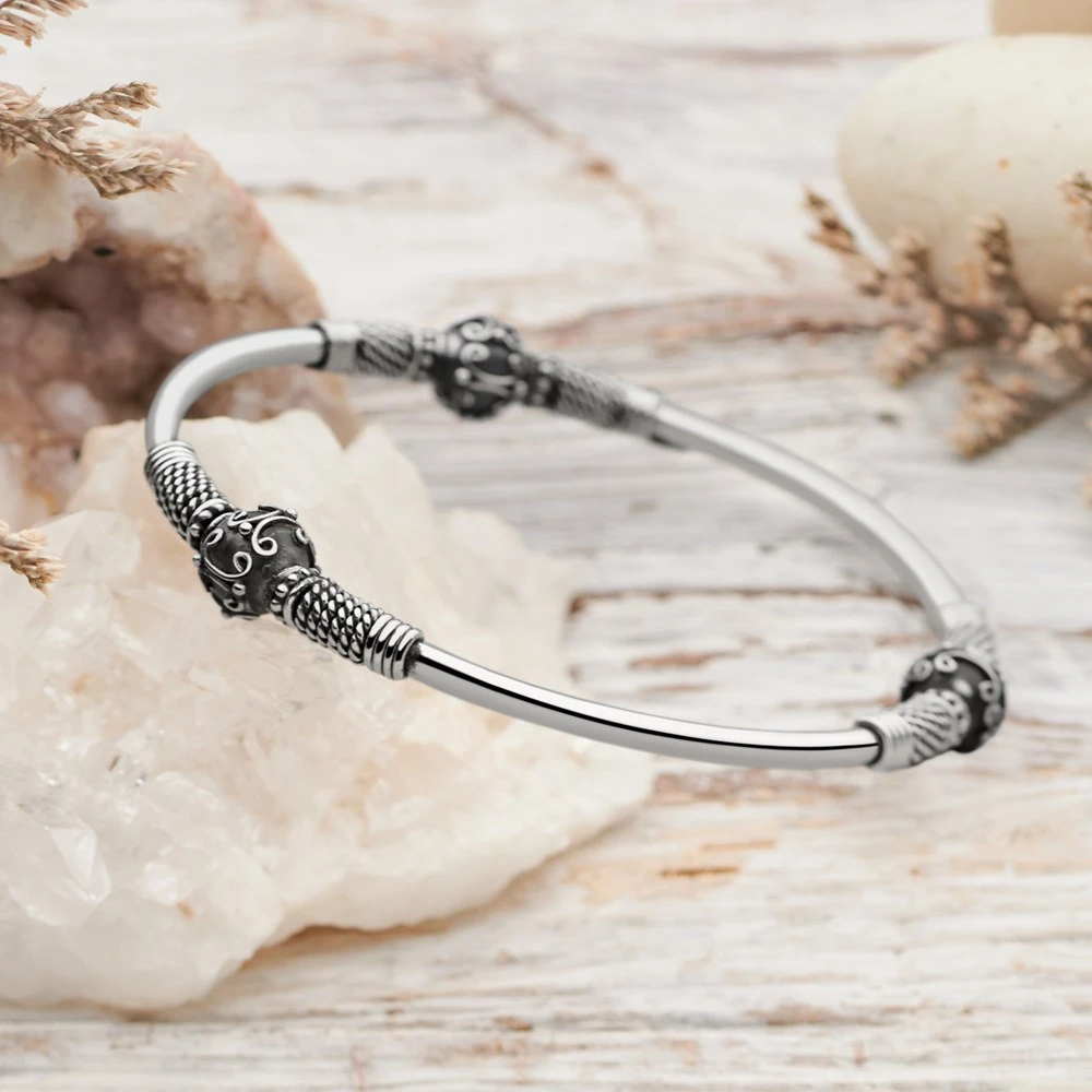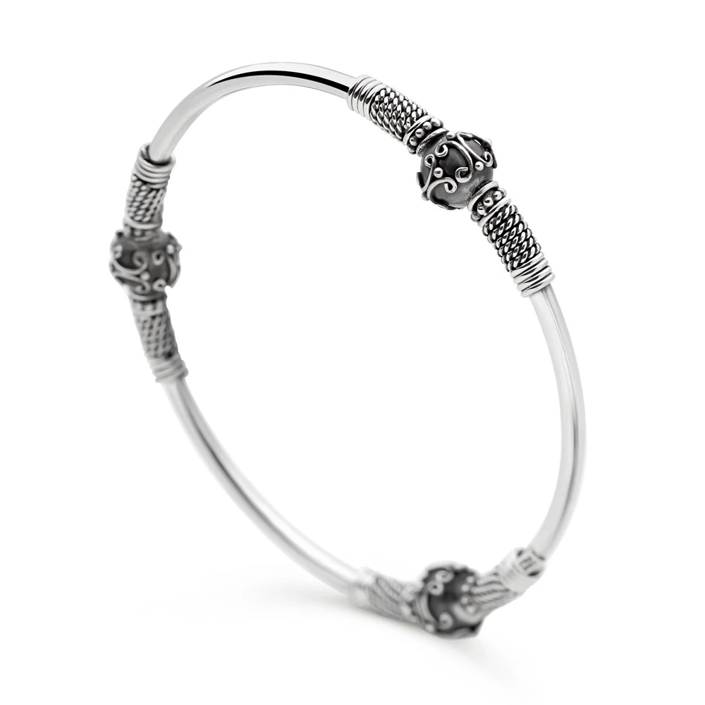 Our collection of artisan-crafted sterling silver bangles includes a range of distinctive shapes and finishes. Our bangle designs feature both polished and oxidised sterling silver as well as traditional Balinese motifs and dramatic semi-precious stones. Width: 9mm (widest part) 4mm (smallest part). Diameter: 65mm.