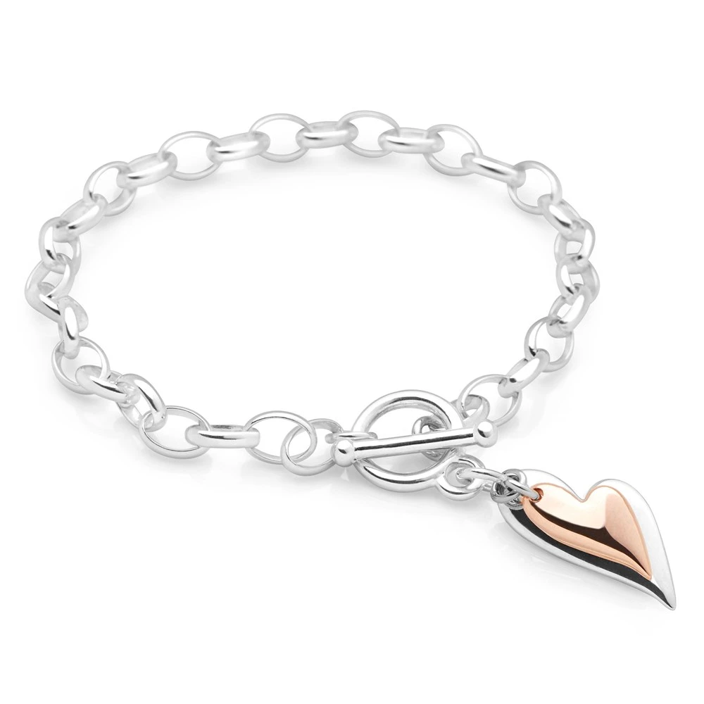 A smooth silver heart is highly polished to reflect the dazzling beauty of a curvaceous rose gold-plated heart. Finished with a classic T-bar, these feminine heart charms sit on a chunky chain for a romantic silhouette. Bracelet length: 19cm (inc T-bar).