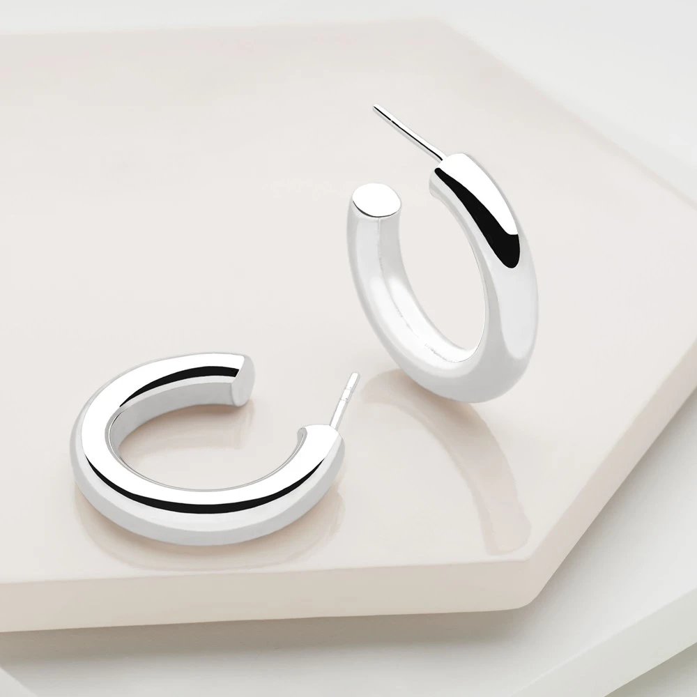 These on trend silver hoops really stand out, featuring a chunky tubular body and high shine silver finish fastened with butterfly backs. Surprisingly lightweight for comfortable, prolonged wear.