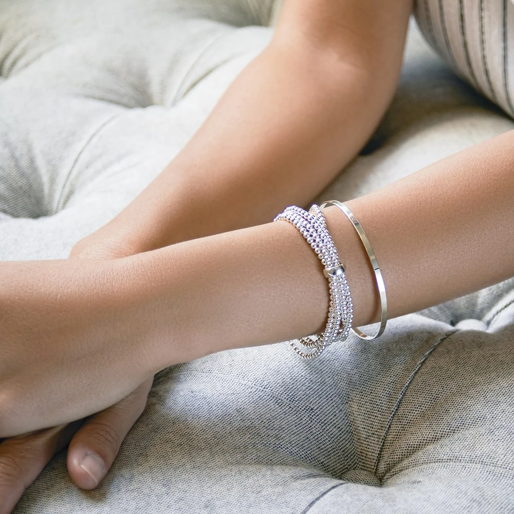 Fall in love with this distinctive shining sterling silver stack you will wear forever. A stream of beads is held together with a delicate bead to sit prettily next to a classic silver bangle. Enhance your jewellery collection with the different shapes and textures with this set.