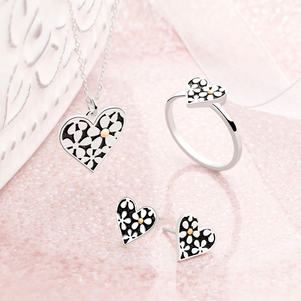 A delicate silver chain that hosts the most adorable daisies in a contrasting black heart.