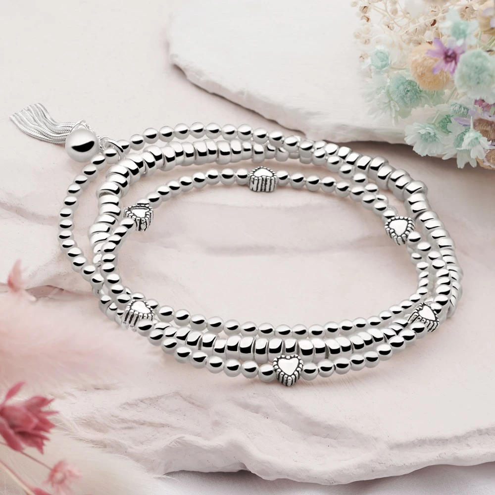 Fall in love forever with this classic set of three bracelets. Adorned with silver hearts and tassel charm for a look thatโs so pretty and easy to wear, these delicately beaded bracelets are designed to elegantly frame your wrist. Enhance your jewellery collection with the different shapes and textures with this set.