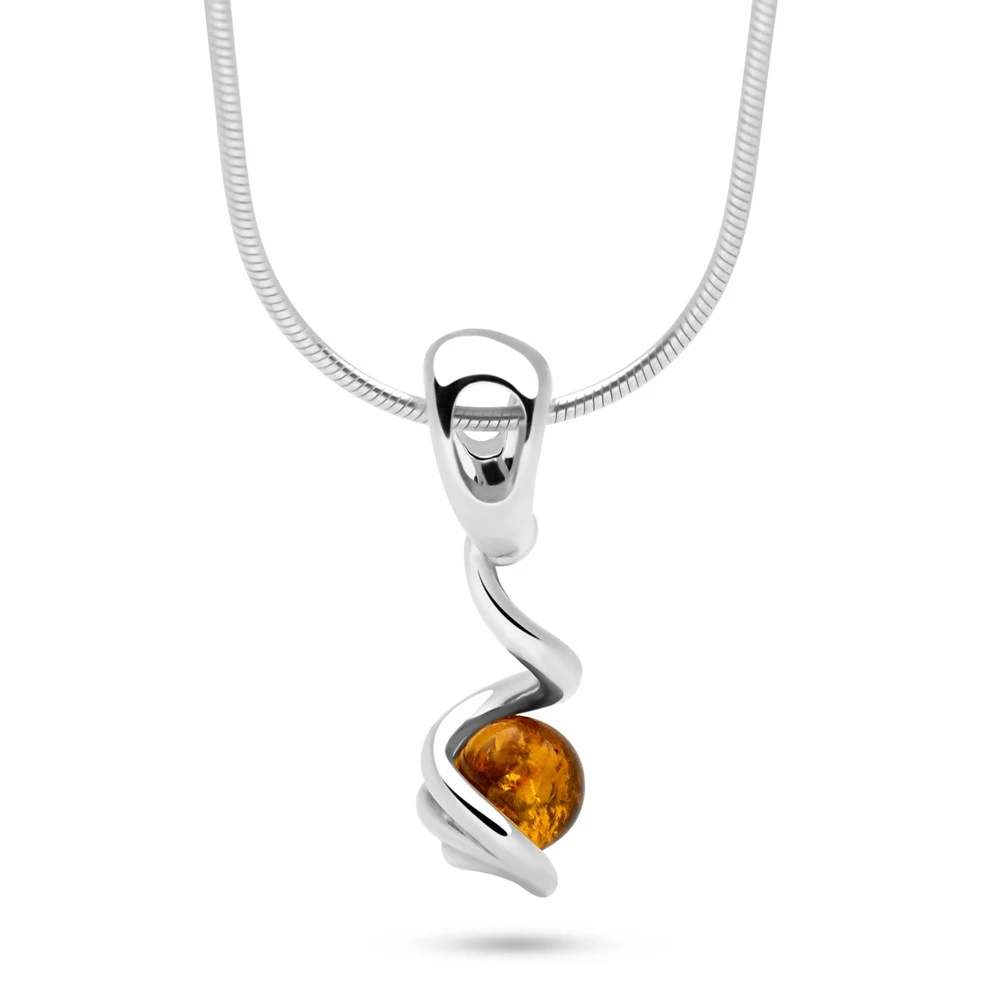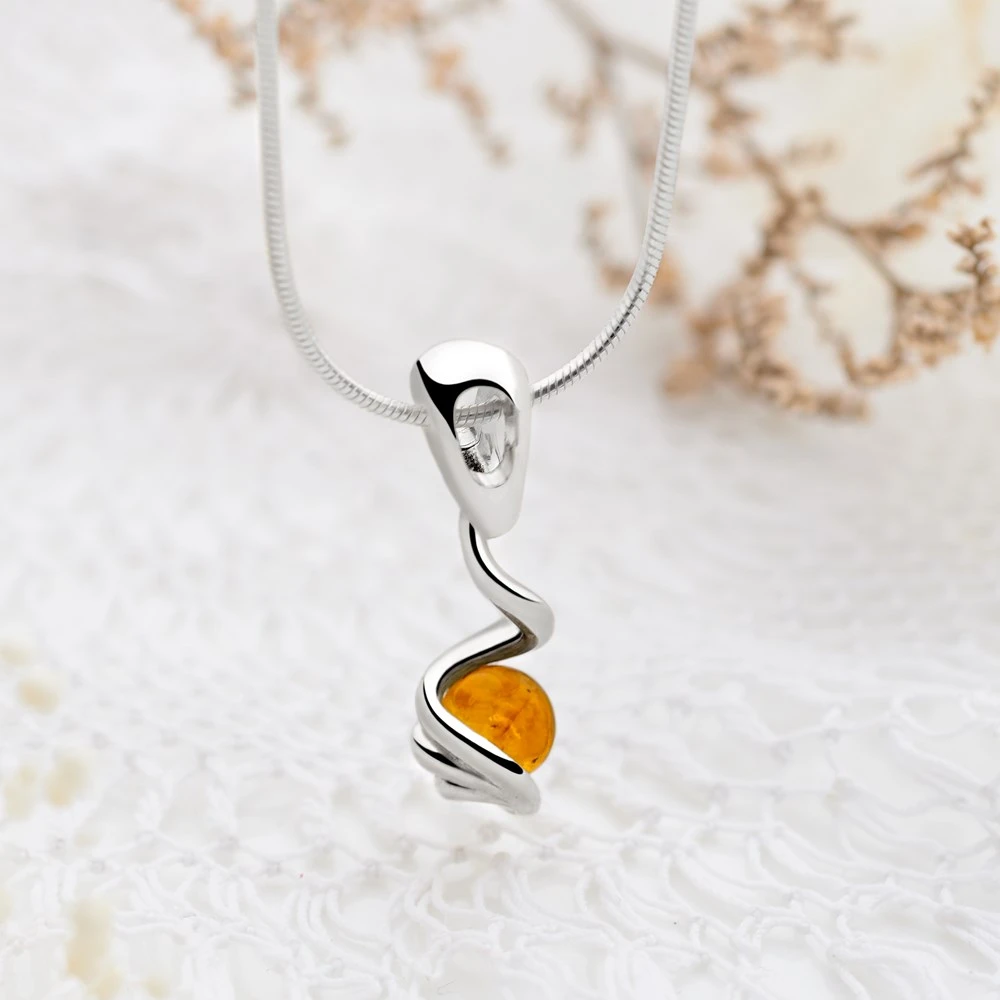 An enchanting marble of cognac amber set in a bed of silver whirls. Swings gracefully with movement and releases a warming glow in the light, the perfect eye-catching piece for this Autumn. Size: 30x11mm (inc loop).