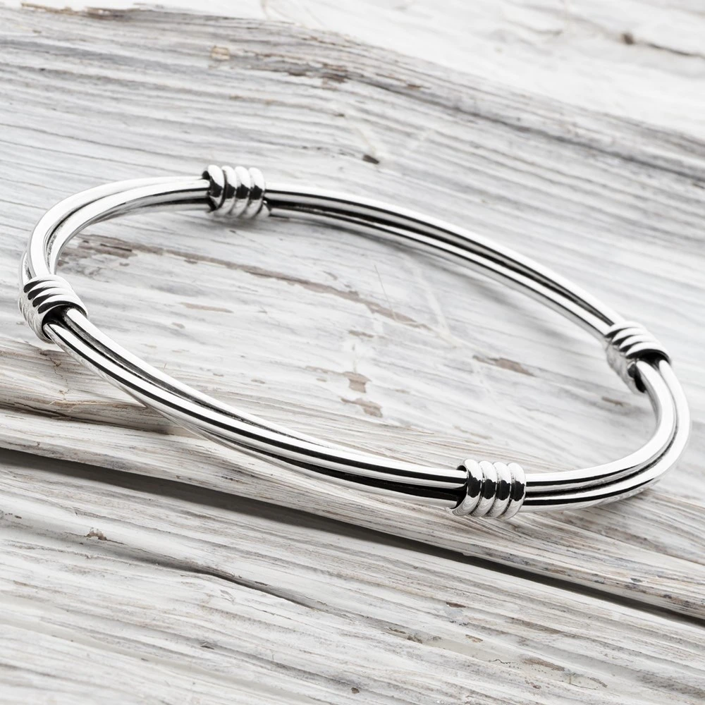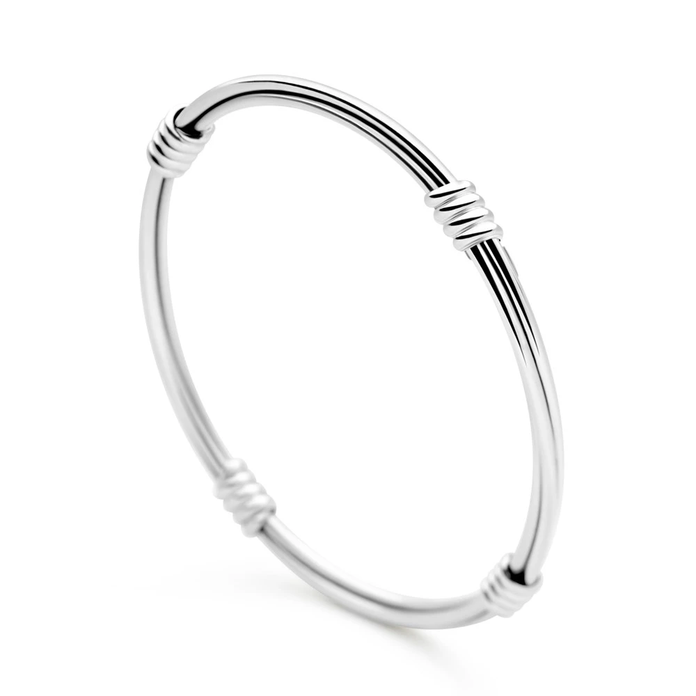 We adore the subtlety of this new design. Perfectly poised between delicate and chunky, this sweet silver bangle features a trio of interlinked loops, exquisitely held in place by four mini links, positioned north, south, east and west. Diameter: 65mm.