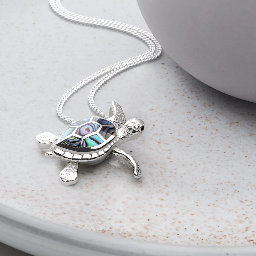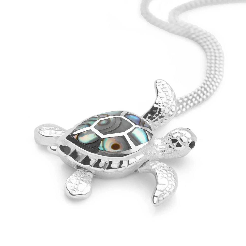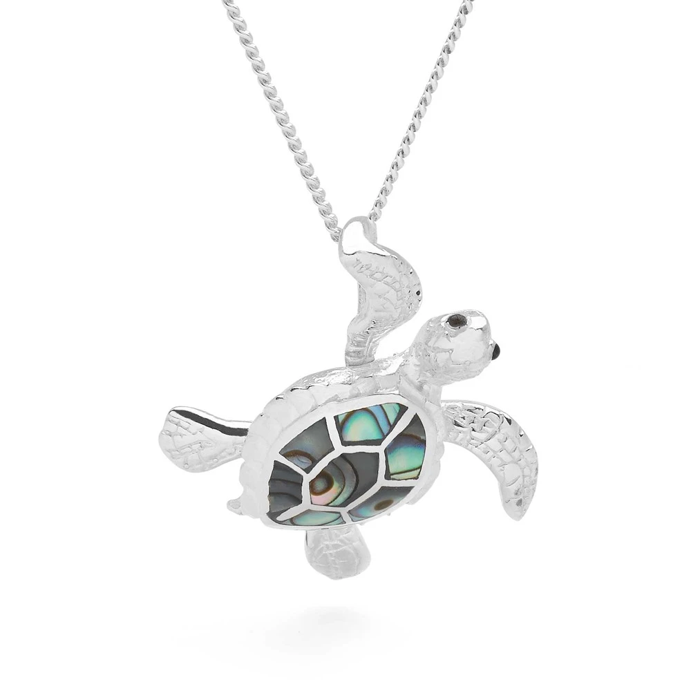 A wonderfully detailed turtle with moving fins, inlaid with abalone shell. With, iridescent flashes of green and purple against the shining silver body, this quirky design is sure to turn heads. Size: 22x23mm. Includes 40cm curb chain. Longer chains available.
