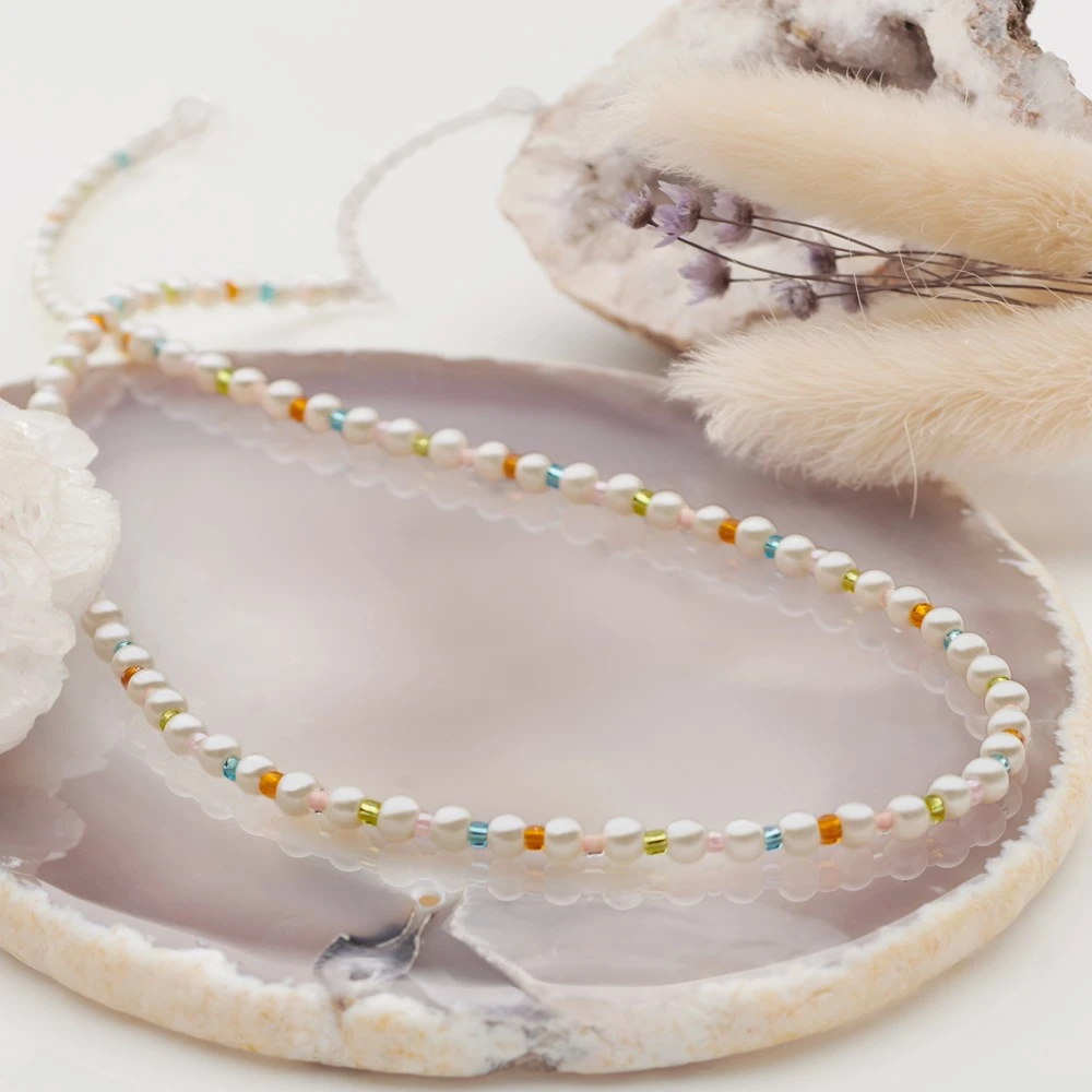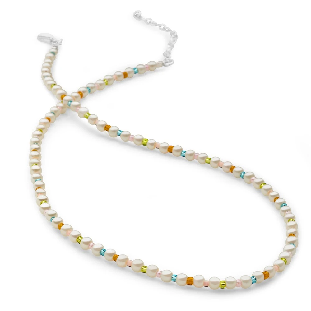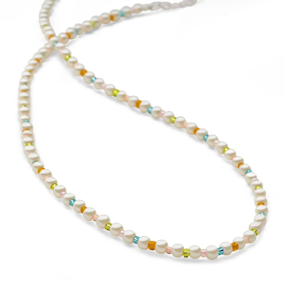 Creamy white pearls are decorated with colourful beads at each interval. This chain adds subtle style when worn alone or mix with other chains in your collection for that on trend, layered look.
