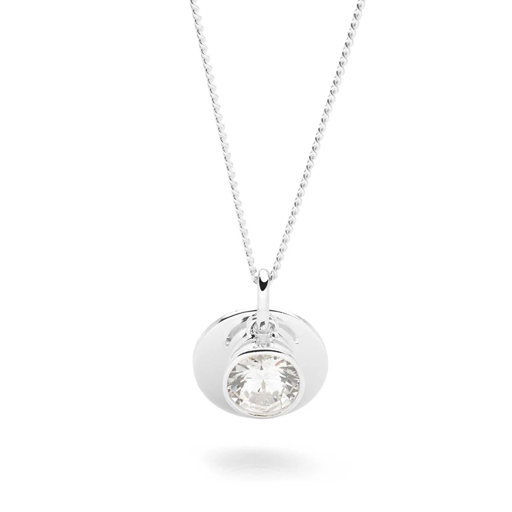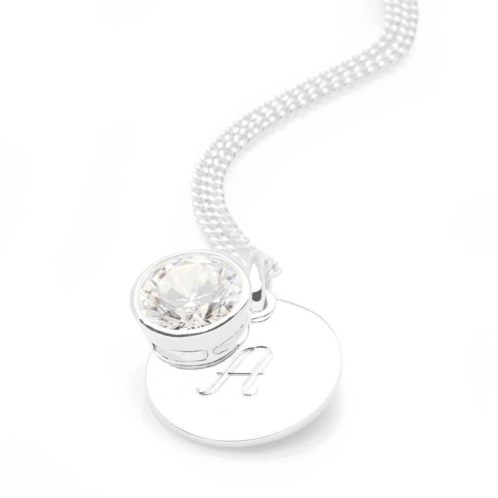 This sterling disc pendant in high shine silver with an shining clear cubic zirconia stone makes a wonderful gift for those closest to your heart. We can only engrave in the font shown (in capital letters) with all numbers. No two pieces will be alike. Pendant size: 18x15mm (inc loop). Includes 40cm curb chain. Longer chains available.
