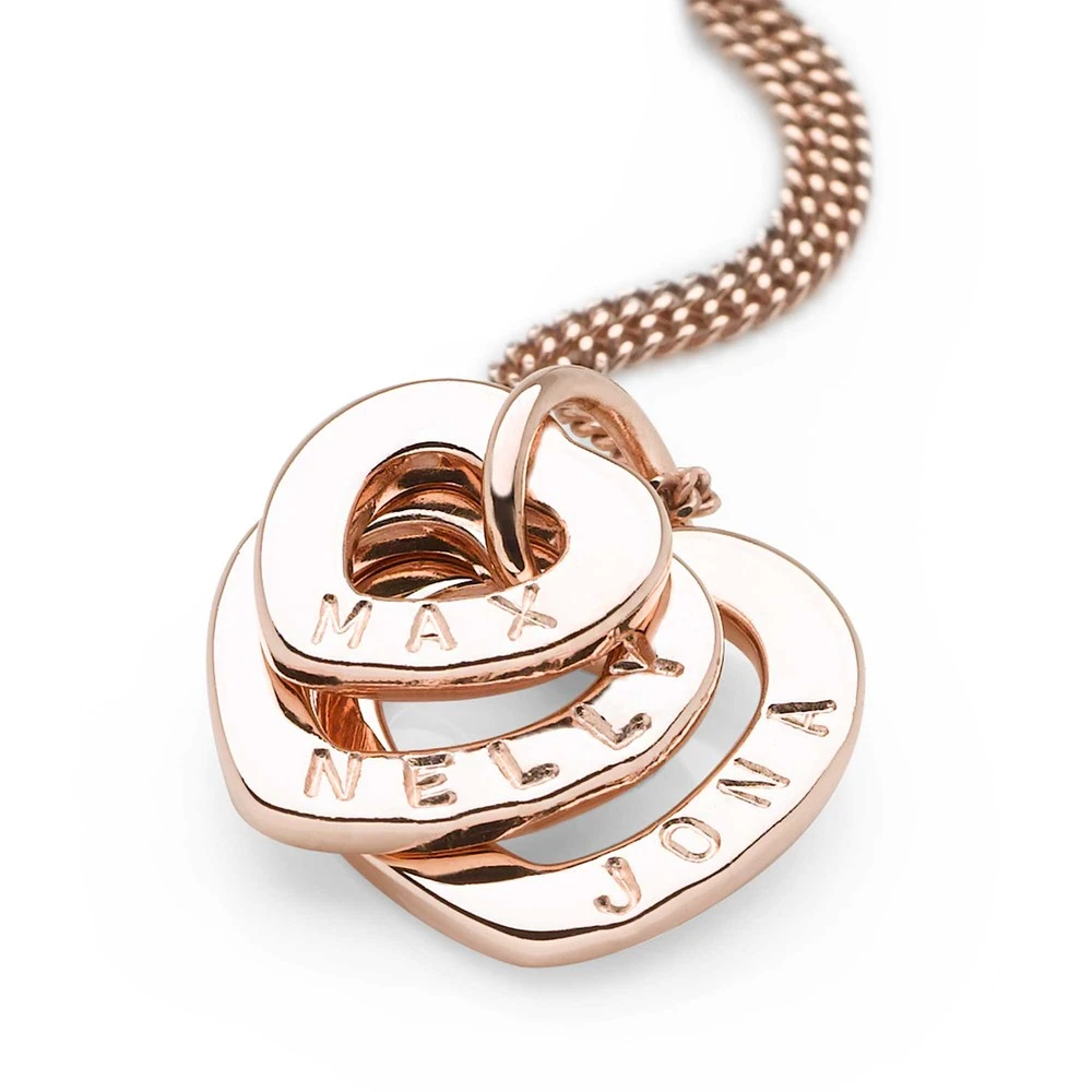 A beautiful rose gold pendant with three different sized hearts which can personalise. A classic piece which makes a wonderful gift and can be personalised with children’s names, newlyweds and the date of their special day or anything personal to you. We can only stamp in the font shown with the Roman alphabet and all numbers The text is hand stamped letter by letter. This creates a quirky uneven finish rather than a perfect machine straight finish. We do this as we feel it adds to the individual charm of each piece. No two pieces will be alike.
