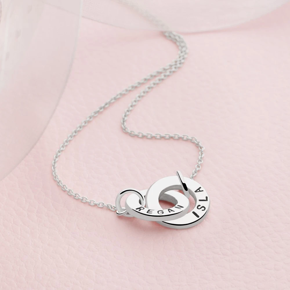 Two intertwined rings, can be hand stamped with your unique personalisation. Maximum of 13 characters per ring. Diameter of rings: 13mm. Width per ring: 3mm. Length: 40cm, 42.5cm, 45cm (adjustable).