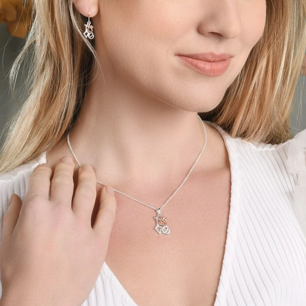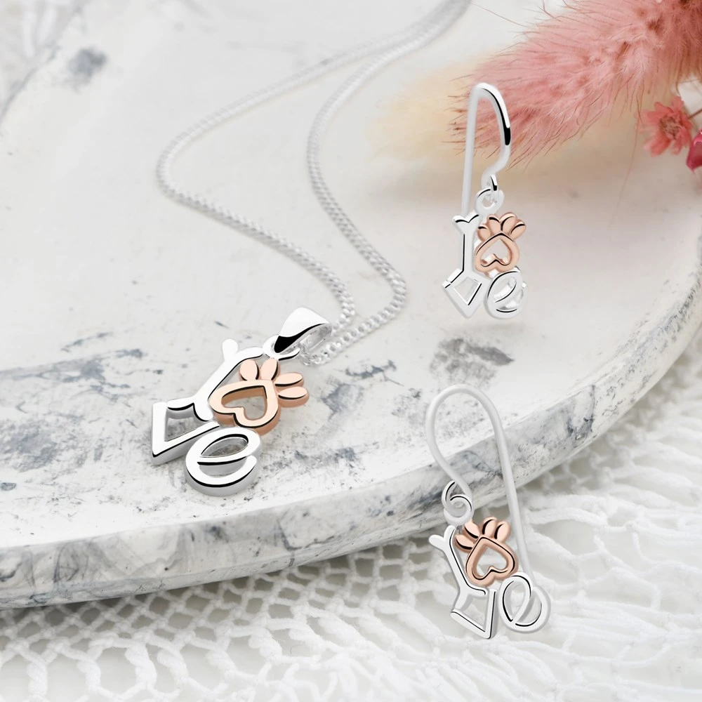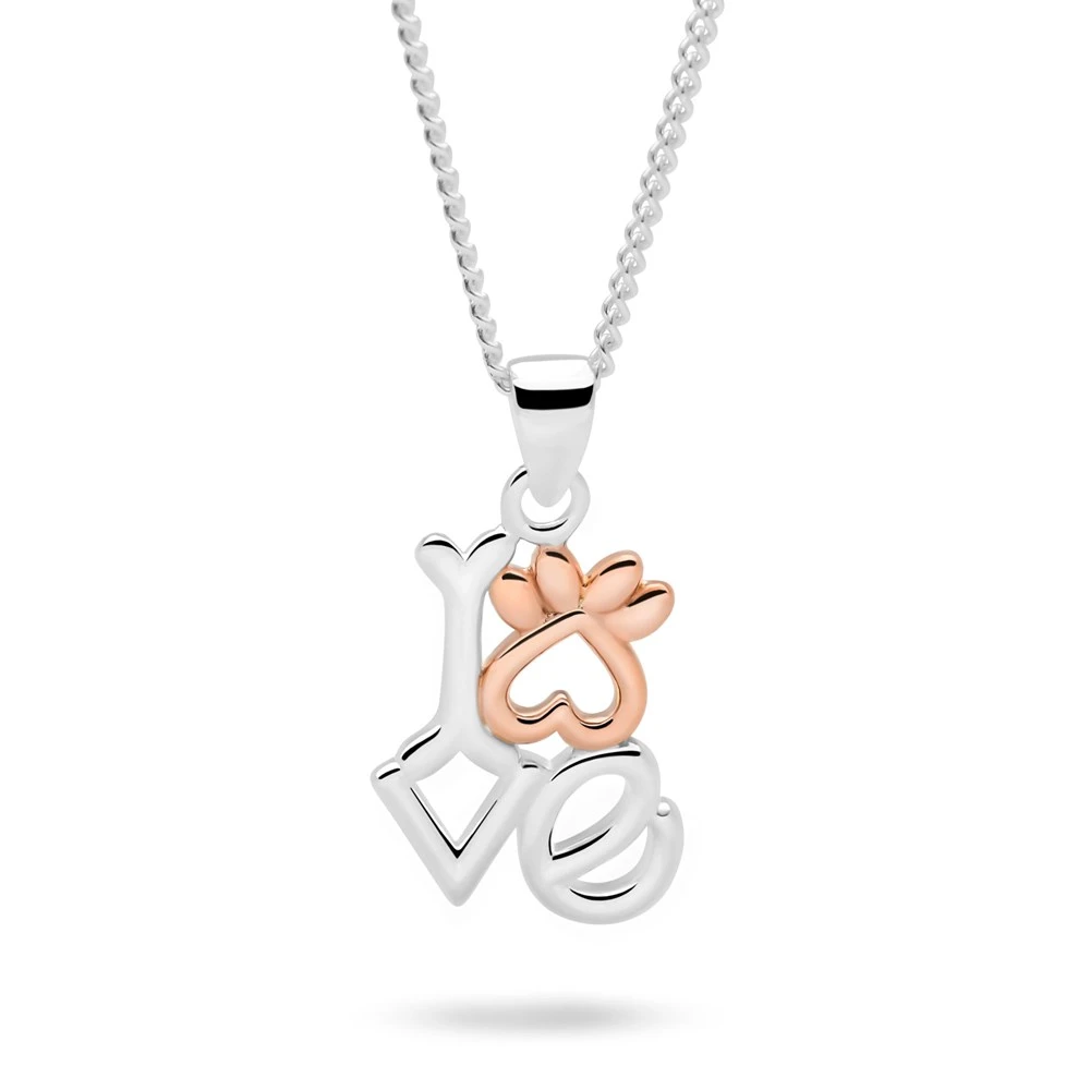 Show love for your furry friend with this ‘Love’ pendant finished in silver and rose gold plate. We love the clever incorporation of a paw print and bone worked into the design.