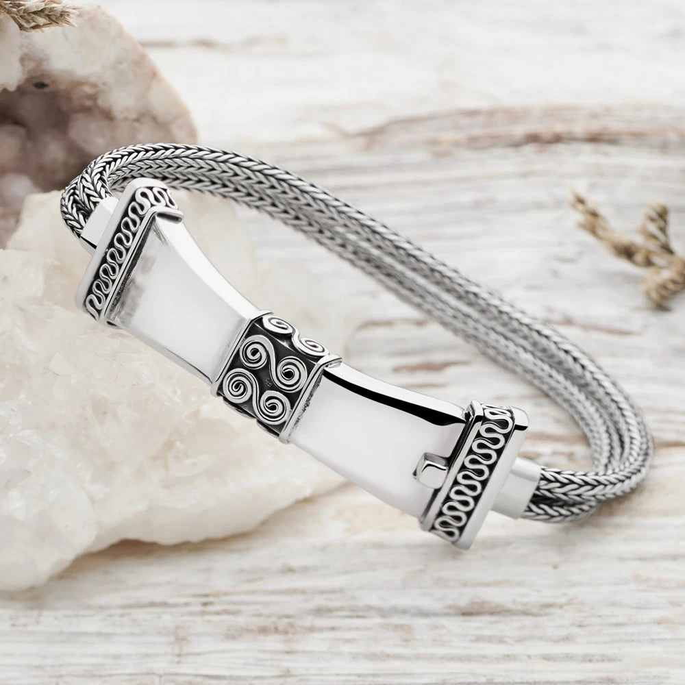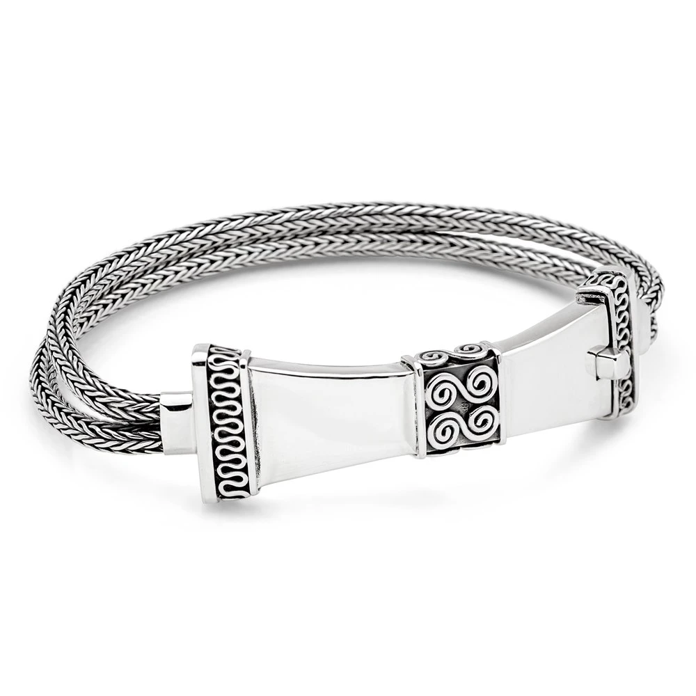 A sensational everyday piece combining the fluidity of a chain with the poise of a bracelet. Twin snake chain encircle the wrist and fasten with a shapely solid silver clasp embellished with silver wire details in a look that always gets you noticed. Length: 21cm Width: 13mm