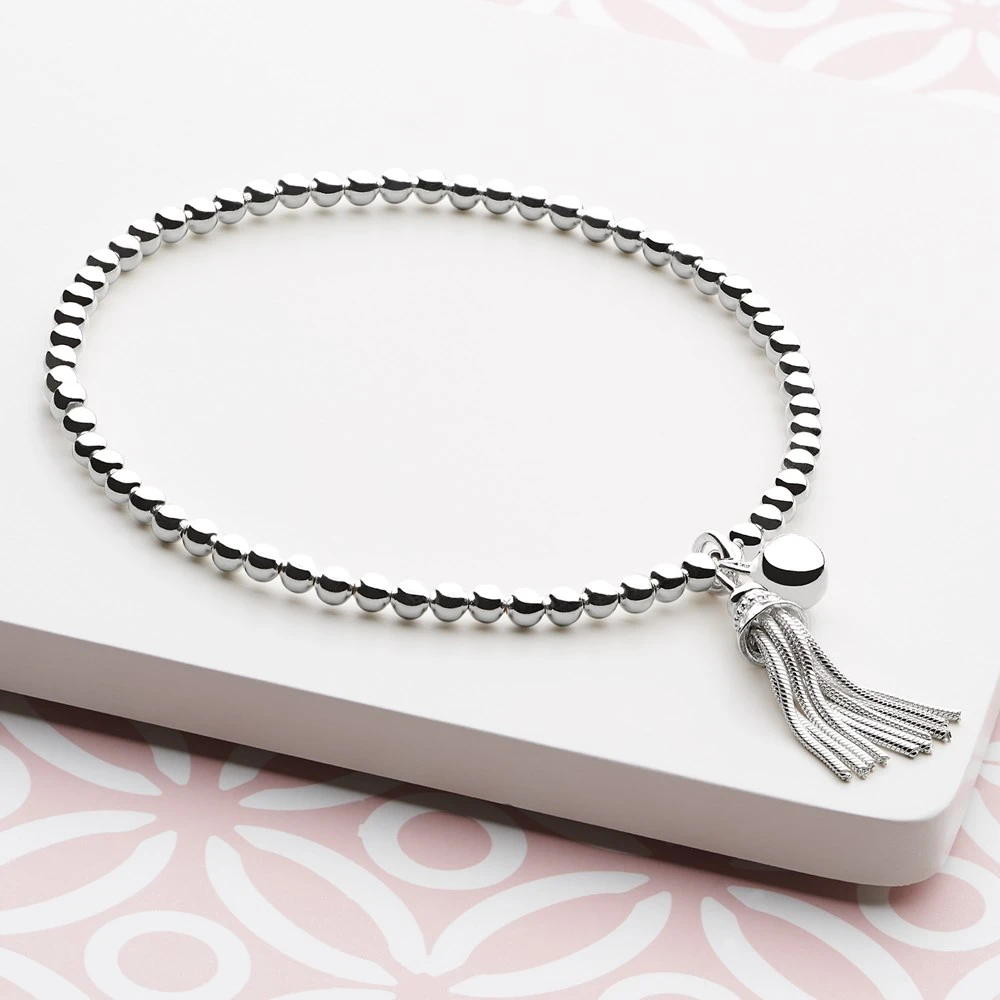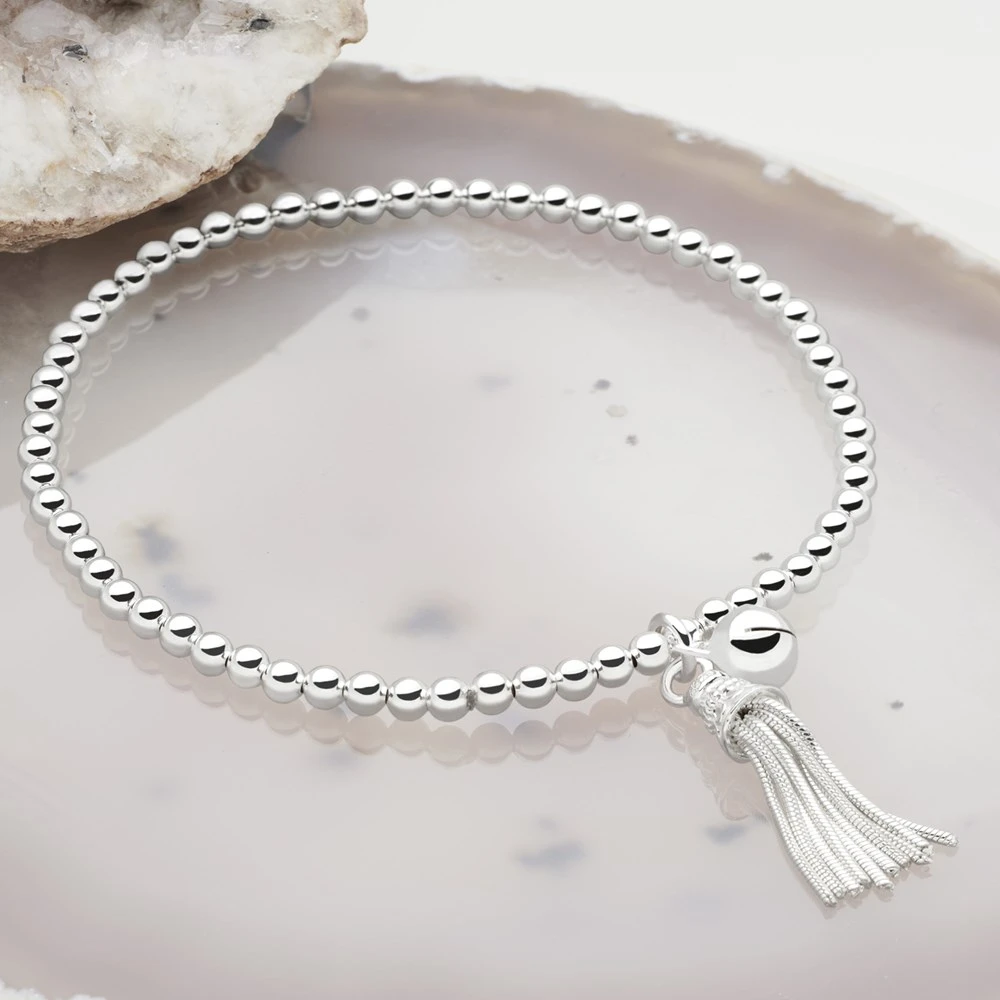 From the miniature silver tassel and dainty silver bell to the dazzling silver beads, this bracelet is brilliantly adorable. Designed to elegantly hang from your wrist, swaying and chiming with the slightest of movements.