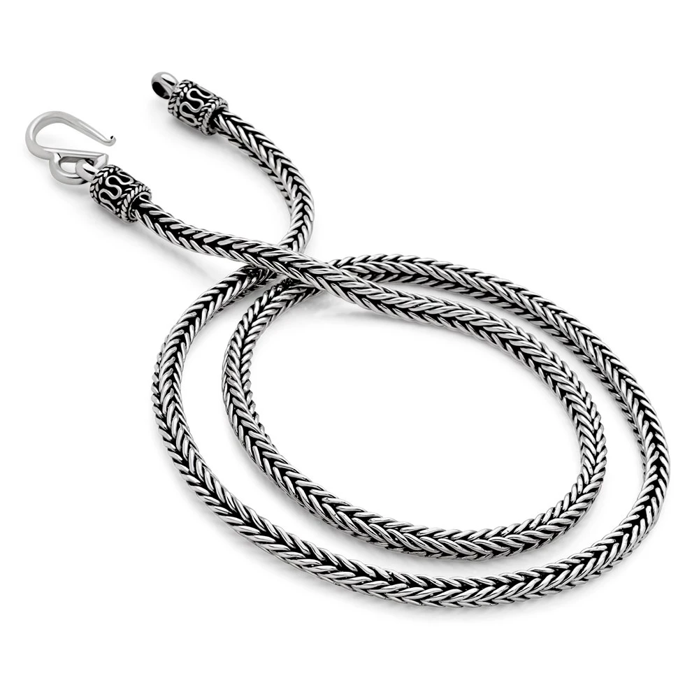 Simply silver at its best. This stunning, flat edged oxidised necklace is a favoured style in the orient. A perfect everyday piece! In the popular Tulang Naga Kotak weave. Width: 3mm.