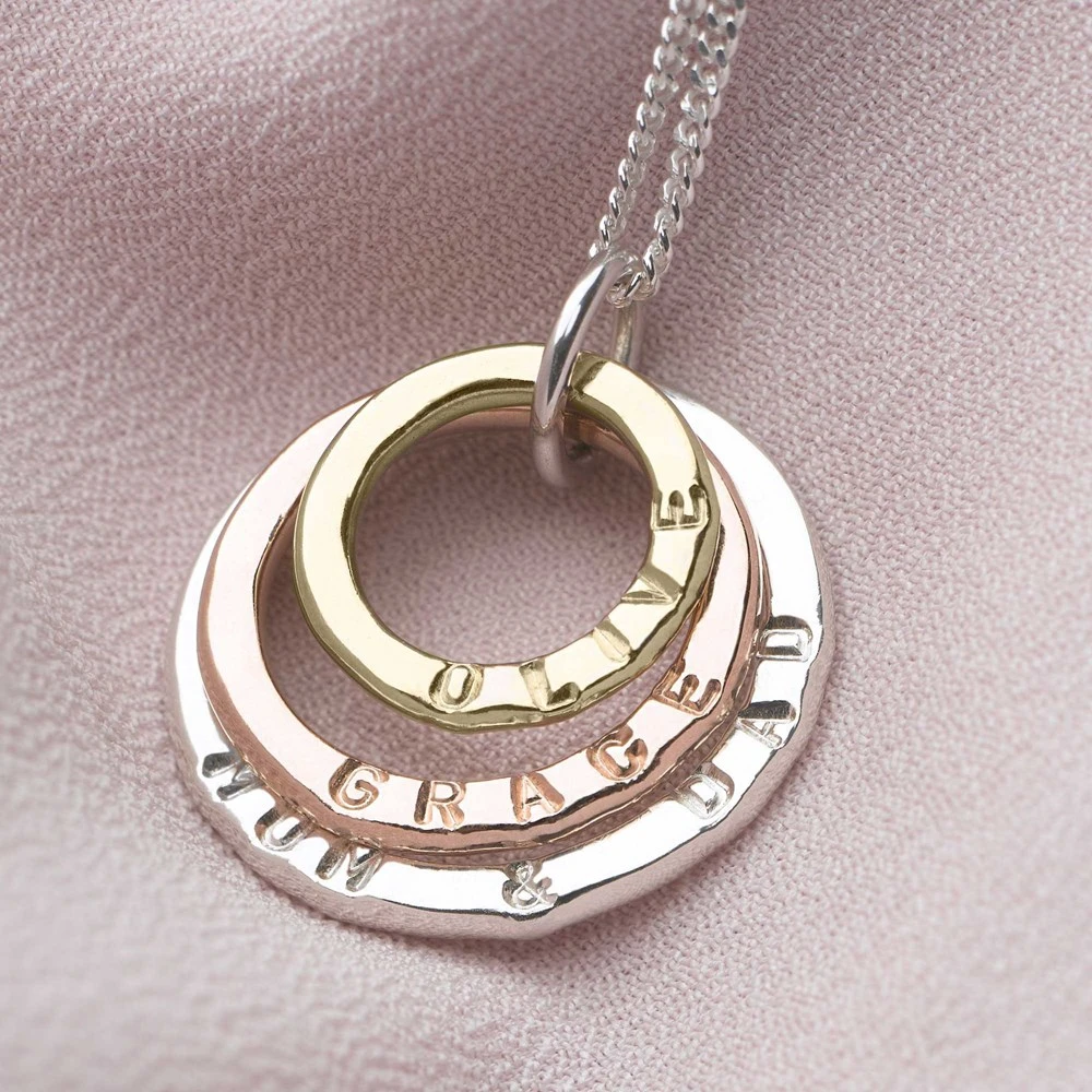 A beautiful pendant with hoops in silver, rose gold and gold plating which you can personalise. A classic piece which makes a wonderful gift and can be personalised with childrens names, newlyweds and the date of their special day or anything personal to you. We can only stamp in the font shown with the Roman alphabet and all numbers. The text is hand stamped letter by letter. This creates a quirky uneven finish rather than a perfect machine straight finish. We do this as we feel it adds to the individual charm of each piece. No two pieces will be alike.