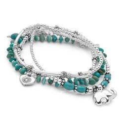 The beautiful tones of real turquoise are highlighted by shining silver beads with stunning oxidised detail in this set of four bracelets. Finished with a cute elephant and a bright heart charm, this set adds a pop of colour and looks stunning against sun kissed skin. Enhance your jewellery collection with the different shapes and textures with these bracelets.